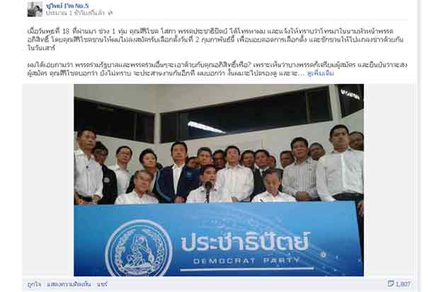 เมื่อวันพุธที่ 18 ที่ผ่านมา ช่วง 1 ทุ่ม คุณศิริโชค โสภา พรรคประชาธิปัตย์ ได้โทรหาผม และแจ้งให้ทราบว่าโทรมาในนามหัวหน้าพรรคอภิสิทธิ์ โดยคุณศิริโชคชวนให้ผมไม่ลงสมัครรับเลือกตั้งวันที่ 2 กุมภาพันธ์นี้ เพื่อบอยคอตการเลือกตั้ง และชักชวนให้ไปแถลงข่าวด้วยกันในวันเสาร์