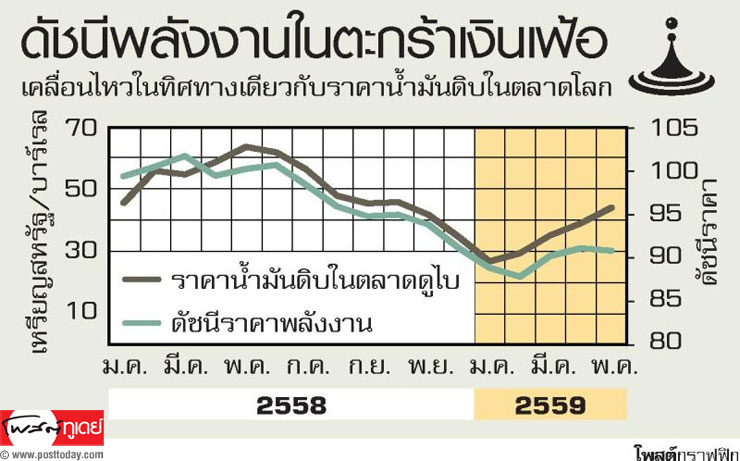 ราคาน้ำมันดิบในตลาดโลกที่เร่งขึ้นกว่าที่คาดไว้ ประกอบกับภาวะภัยแล้งที่กระทบราคาอาหารสูงกว่าที่ประเมินไว้ จนอัตราเงินเฟ้อขยายตัวเป็นบวก 2 เดือนติดต่อกันในเดือน เม.ย.และ พ.ค. โดยราคาอาหารที่สูงขึ้นคาดว่าเป็นปัจจัยชั่วคราว และผลกระทบจะทยอยหมดไปไตรมาส 3 ขณะที่การปรับสมมติฐานราคาน้ำมันในช่วงครึ่งปีหลังที่สูงกว่าที่คาดไว้เดิม ประกอบกับฐานราคาพลังงานในประเทศที่ต่ำในปีที่ผ่านมาจะเป็นแรงกดดันต่ออัตราเงินเฟ้อทั่วไปในช่วงครึ่งหลังของปี 2559 ให้ปรับตัวสูงขึ้นตามไปด้วย ส่งผลให้กรอบประมาณการเงินเฟ้อทั่วไปทั้งปี 2559 สูงขึ้นไปอยู่ที่ 0.6 (กรอบประมาณการที่ร้อยละ 0.3 ถึง 0.9)