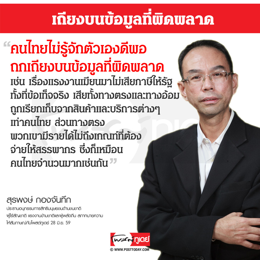 คนไทยไม่รู้จักตัวเองดีพอ ถกเถียงบนข้อมูลที่ผิดพลาด เช่น เรื่องแรงงานเมียนมาไม่เสียภาษีให้รัฐ ทั้งที่ข้อเท็จจริง เสียทั้งทางตรงและทางอ้อม ถูกเรียกเก็บจากสินค้าและบริการต่างๆ เท่าคนไทย ส่วนทางตรงพวกเขามีรายได้ไม่ถึงเกณฑ์ที่ต้องจ่ายให้สรรพากร ซึ่งก็เหมือนคนไทยจำนวนมากเช่นกัน
