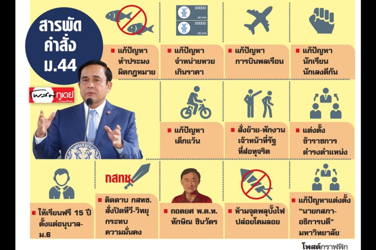 ทั้งนี้ มาตรา 44 บัญญัติไว้ว่า ในกรณีที่หัวหน้า คสช.เห็นเป็นการจำเป็นเพื่อประโยชน์ในการปฏิรูปในด้านต่างๆ การส่งเสริมความสามัคคีและความสมานฉันท์ของประชาชนในชาติ หรือเพื่อป้องกัน ระงับ หรือปราบปรามการกระทำอันเป็นการบ่อนทำลายความสงบเรียบร้อยหรือความมั่นคงของชาติ ราชบัลลังก์ เศรษฐกิจของประเทศ หรือราชการแผ่นดิน