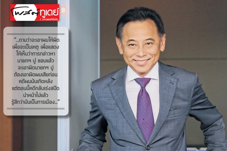"...ถามว่าจะเอาผมให้ผิดเพื่อจะเป็นเหตุ เพื่อแสดงให้เห็นว่าการกล่าวหานายกฯ ปู ชอบแล้ว จะเอาผิดนายกฯ ปู ต้องเอาผิดผมเสียก่อน คดีผมมันเกิดหลัง แต่ตอนนี้คดีกลับเร่งสปีดนำหน้าไปแล้ว รู้สึกว่ามันเป็นการเมือง..."