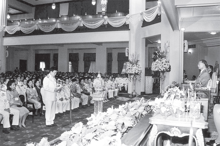 “ขอทุกท่านทำงานด้วยความตั้งใจอย่างดีที่สุดเพื่อผลสำเร็จของบ้านเมืองในทุกสาขา ในทุกด้านมีความพอใจในงานการ และมีความสำเร็จในงานการ ทำให้ประเทศชาติเป็นที่อยู่ที่สบายในโลก ซึ่งในโลกนี้มีความวุ่นวายพอแล้ว ขอให้ในประเทศไทยมีความเรียบร้อย”