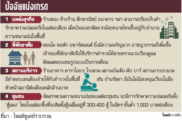 แต่ทำไมตำรวจต้องใส่รองเท้านักวิ่ง คำตอบคือมีขุมทรัพย์มหาศาลและสามารถถอนทุนค่ารองเท้าได้ แต่โรงพักก็มีการจำแนกระดับหรือเกรดเช่นกัน ทั้ง A-B+-B-C ซึ่งระดับของโรงพักก็คือผลประโยชน์ในพื้นที่ โดยมองจาก 4 ปัจจัยสำคัญ (ตามตาราง) ที่ชี้วัดว่าพื้นที่ไหนคือทำเลทอง