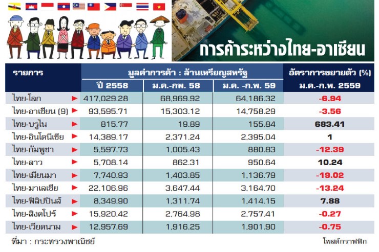 ทั้งนี้ มูลค่าการส่งออกของไทยไปอาเซียนในช่วงเดือน ม.ค.-ก.พ. 2559 มีมูลค่า 8,965.6 ล้านเหรียญสหรัฐ เพิ่มขึ้น 3.5% เมื่อเทียบกับช่วงเดียวกันของปีก่อน ขณะที่การส่งออกโดยรวมทุกประเทศขยายตัว 0.7% หรือมีมูลค่า 34,704.8 ล้านเหรียญสหรัฐ ขณะที่การนำเข้าของไทยในอาเซียนช่วง 2 เดือนที่ผ่านมา มีมูลค่า 5,792.6 ล้านเหรียญสหรัฐ ลดลง 12.8% จากช่วงเดียวกันของปี 2558 ทำให้การค้าโดยรวมของไทยและอาเซียนลดลง 3.7%