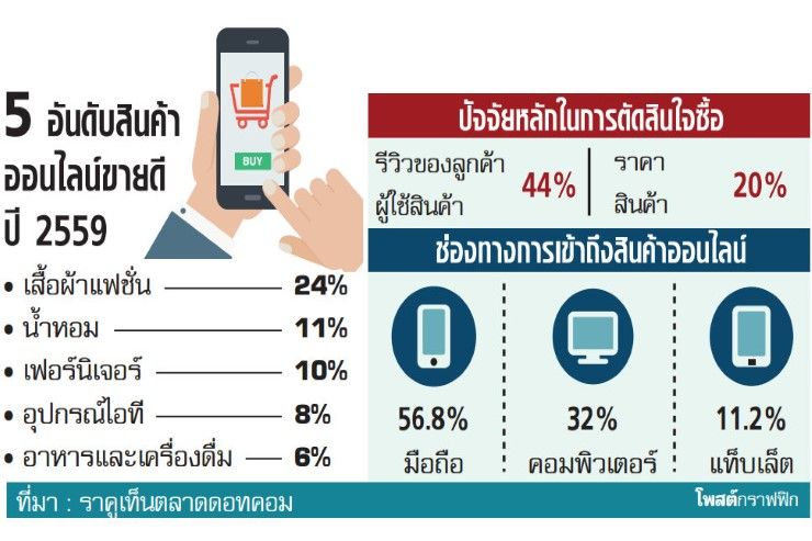 ทั้งนี้ จากข้อมูลปีล่าสุด กิจกรรมการใช้งานอินเทอร์เน็ตผ่านอุปกรณ์เคลื่อนที่หรือสมาร์ทโฟน พบว่า ใช้เพื่อซื้อสินค้าและบริการ 38.4% และเพื่อขายสินค้าและบริการ 22.3% ข้อมูลเหล่านี้สะท้อนให้เห็นถึงพฤติกรรมคนไทยที่ใช้อินเทอร์เน็ตเพิ่มมากขึ้นทุกๆ ปี และสะท้อนถึงจำนวนกลุ่มเป้าหมายที่น่าสนใจของตลาดออนไลน์ที่มากขึ้นและมีมูลค่ามหาศาล หากสามารถเข้าถึงลูกค้าออนไลน์ที่มากขึ้น