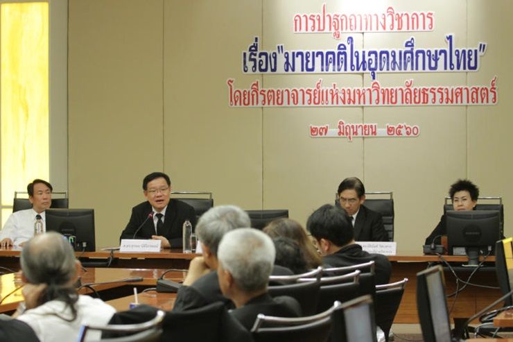 ศ.สุรพล นิติไกรพจน์ กีรตยาจารย์แห่งมหาวิทยาลัยธรรมศาสตร์ (มธ.) สาขาสังคมศาสตร์ ประจำปี 2559 แสดงปาฐกถา หัวข้อ "มายาคติในอุดมศึกษาไทย" ในโอกาสที่ มธ. จัดงานสถาปนามหาวิทยาลัยครบรอบ 83 ปี