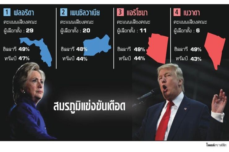ใกล้เข้าไปอีกก้าวสำหรับการเลือกตั้งประธานาธิบดีสหรัฐในวันที่ 8 พ.ย.การแข่งขันระหว่างฮิลลารี คลินตัน ตัวแทนจากพรรคเดโมแครต และ โดนัลด์ ทรัมป์ ตัวแทนจากพรรครีพับลิกัน กำลังเข้มข้นทุกขณะ