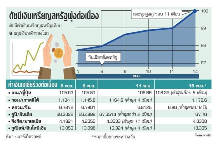 หลังชัยชนะของ โดนัลด์ ทรัมป์ ว่าที่ประธานาธิบดีสหรัฐจากพรรครีพับลิกัน เมื่อวันที่ 8 พ.ย.ที่ผ่านมา ค่าเงินเหรียญสหรัฐแข็งค่าขึ้นอย่างต่อเนื่องจนเกือบแตะจุดสูงสุดในรอบ 14 ปี เมื่อวันที่ 15 พ.ย.ที่ผ่านมา ขณะที่ค่าเงินและตลาดหุ้นของเอเชียปรับตัวลดลงอย่างต่อเนื่อง โดยเฉพาะเกาหลีใต้ ไต้หวัน และอินโดนีเซีย ซึ่งมีเงินไหลเข้ามหาศาลในปีนี้หลังช่วงการทำประชามติออกจากสหภาพยุโรป (อียู) ของอังกฤษเมื่อเดือน มิ.ย.