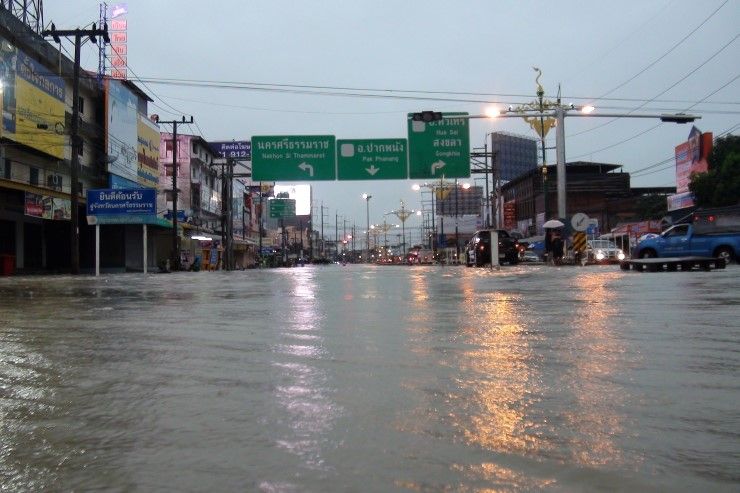 - จ.นครศรีธรรมราช มีฝนสะสม 3 วัน สูงสุดที่ อ.เมือง 700 มม. และ อำเภอโดยรอบ 7 อำเภอ เกิน 450 มม. ทำให้เกิดน้ำท่วม แยกเป็น 3 ส่วน