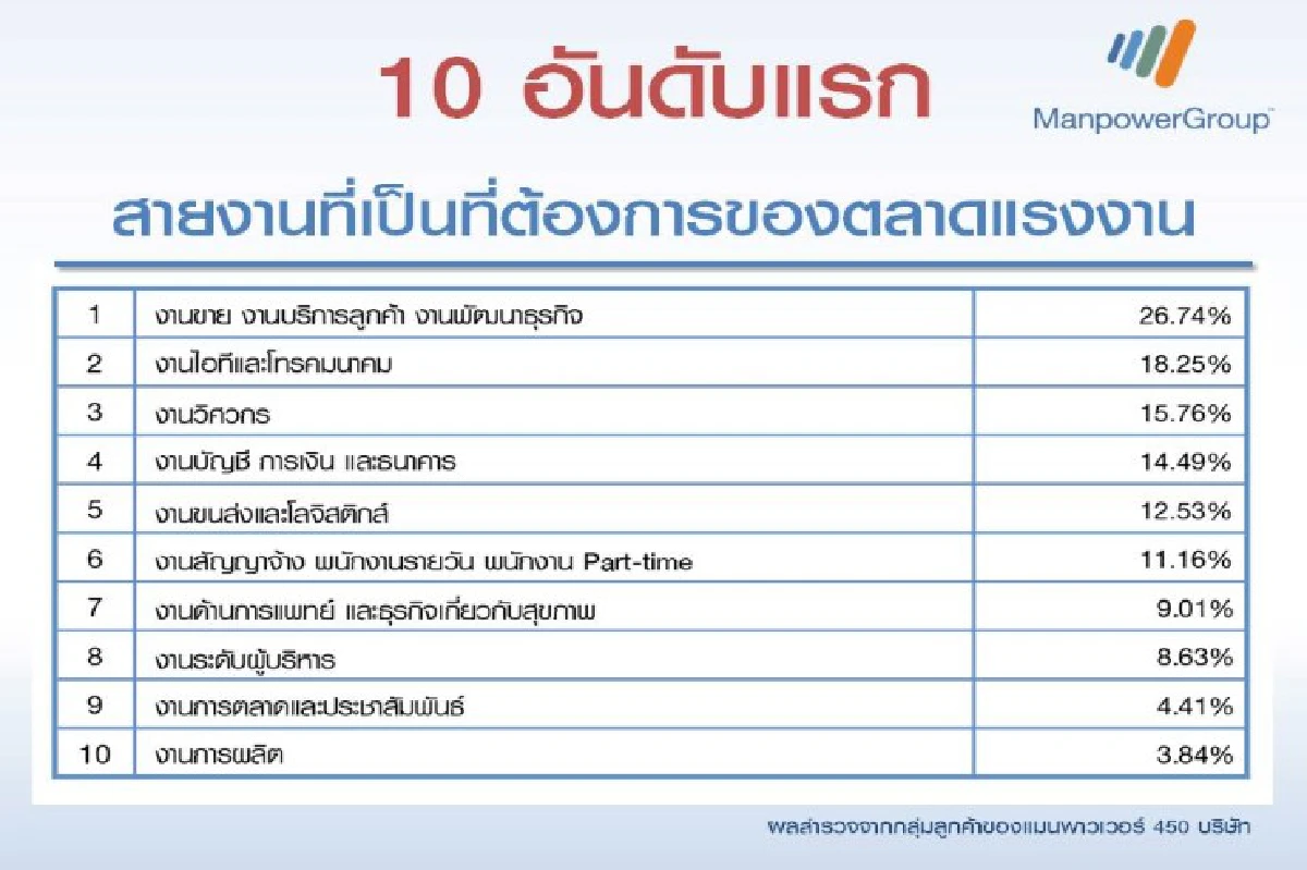 ด้าน 10 อันดับสายงานที่ตลาดแรงงานต้องการคือ 1.งานขาย บริการลูกค้า พัฒนาธุรกิจ 2.งานไอทีและโทรคมนาคม 3.งานวิศวกร 4.งานบัญชี การเงิน และธนาคาร 5.งานขนส่งและโลจิสติกส์ 6.งานสัญญาจ้าง พนักงานรายวัน พนักงานพาร์ทไทม์ 7.งานด้านการแพทย์และธุรกิจเกี่ยวกับสุขภาพ 8.งานระดับผู้บริหาร 9.งานการตลาดและประชาสัมพันธ์ 10.งานการผลิต