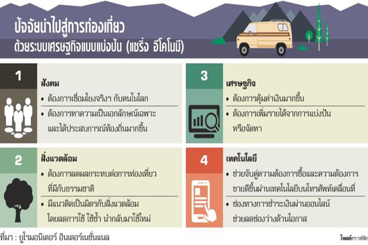เหตุนี้คนที่มีความคิดสร้างสรรค์ จึงทำธุรกิจเกิดใหม่บนพื้นฐานเทคโนโลยี (สตาร์ทอัพ) สร้างแพลตฟอร์มการท่องเที่ยวใหม่ ตอบสนองไลฟ์สไตล์การท่องเที่ยวตามแนวคิดเศรษฐกิจแบบแบ่งปัน (แชริ่ง อีโคโนมี) เช่น แอร์บีเอ็นบี ที่โด่งดังทั่วโลก เป็นแพลตฟอร์มให้คนนำบ้านหรือห้องของตัวเองมาปล่อยให้นักท่องเที่ยวเช่า ขณะที่ในไทยก็เริ่มมีคนคิดค้นแพลตฟอร์มการท่องเที่ยวที่ตอบโจทย์แชริ่ง อีโคโนมีบ้างแล้ว เช่น โกเยปเป้ เทคมีทัวร์ และเอเนซท์