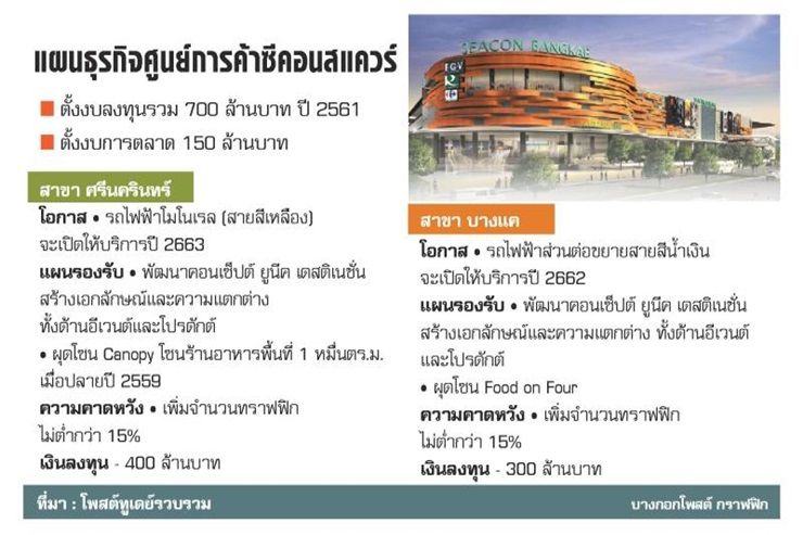 โครงการรถไฟฟ้าที่เกิดขึ้นครอบคลุม ทั่วทุกมุมเมือง กลายเป็นโอกาสสำคัญในการผลักดันการเติบโตของธุรกิจศูนย์การค้าซีคอนสแควร์ทั้งสาขาศรีนครินทร์และบางแค เพราะมีรถไฟฟ้าวิ่งผ่านทั้งสองโครงการ ทำให้ซีคอนเร่งปรับกลยุทธ์และพัฒนาศูนย์ทั้งสองแห่งเพื่อรองรับโอกาสดังกล่าว