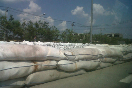 ภาพ:ซุปเปอร์แบ็กวางกั้นน้ำก่อนเข้าสนามบินสุวรรณภูมิเส้นทางเข้าจากเส้นบางนา-ตราด ขณะที่เส้นทางอื่นโดยรอบเจ้าหน้าที่กำลังช่วยกันบรรจุกระสอบทรายกั้นน้ำอย่างต่อเนื่อง