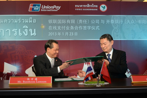 นายบัณฑูร ล่ำซำ ประธานเจ้าหน้าที่บริหาร ธนาคารกสิกรไทย เปิดเผยว่า ธนาคารกสิกรไทยและยูเนียนเพย์ อินเตอร์เนชั่นแนล ซึ่งเป็นบริษัทผู้ให้บริการบัตรเครดิตและบัตรเดบิตยูเนียนเพย์ที่มียอดผู้ถือบัตรมากที่สุดในโลกจากประเทศจีน ได้ลงนามความร่วมมือในการเชื่อมระบบชำระเงินระหว่างกัน เพื่ออำนวยความสะดวกให้นักท่องเที่ยวและคนจีนที่อยู่ในประเทศไทยในการทำธุรกรรมทางการเงินต่าง ๆ มากยิ่งขึ้น โดยจะเริ่มจากการให้บริการรับชำระค่าสินค้าและบริการทางอินเทอร์เน็ต (K-Payment Gateway) ได้เป็นธนาคารแรกในประเทศไทย ซึ่งในระยะแรกจะสามารถรองรับบริการรับบัตรเครดิตและบัตรเดบิตยูเนียนเพย์ ที่ออกโดยธนาคารและสถาบันการเงินในประเทศจีน ในอนาคตจะขยายการรับบัตรที่ออกโดยธนาคารและสถาบันการเงินทั่วโลกต่อไป