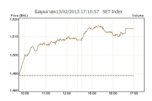 ตลาดหุ้นวันที่ 13 ก.พ. ดัชนีหุ้นเปิดตลาดบวกแรง และสามารถยืนในแดนบวกได้ตลอดทั้งวัน โดยได้รับแรงหนุนจากการเข้าซื้อหุ้นขนาดใหญ่ในกลุ่มพลังงานและธนาคาร เป็นตัวดันให้ดัชนีทะลุระดับ 1,500 จุด และมาปิดตลาดที่ระดับ 1,514.11 จุด เพิ่มขึ้น 25.16 จุด หรือ 1.69% มูลค่าการซื้อขาย 72,023.79 ล้านบาท