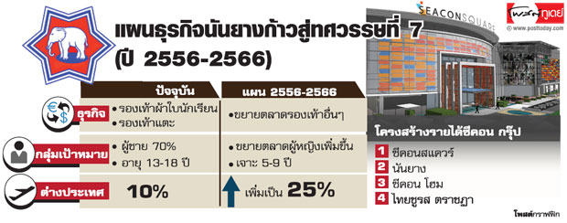 อย่างไรก็ตามในปีนี้จะลงทุน 100 ล้านบาท เพิ่มกำลังผลิต 20% จากปัจจุบันมีกำลังผลิตรองเท้า 20 ล้านคู่ต่อปี รองรับแผนขยายตลาดในประเทศและอาเซียน ซึ่งจะส่งออกรองเท้าแตะช้างดาวทำตลาดในเชิงรุก ส่วนในไทยมุ่งขยายฐานลูกค้ากลุ่มเด็กประถม 59 ปี ซึ่งเป็นตลาดใหญ่สัดส่วน 3040% เพื่อต่อยอดนันยางซึ่งเป็นแบรนด์แข็งแกร่งกลุ่มเด็กมัธยม