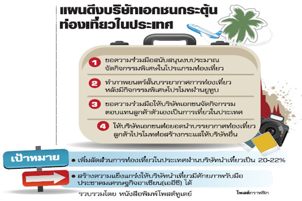 หนึ่งในแนวทางสำคัญที่จะคงหรือเพิ่มสัดส่วนคนไทยเที่ยวในประเทศผ่านบริษัทนำเที่ยวได้ คือ การขอความร่วมมือบริษัทเอกชนขนาดใหญ่ในทุกกลุ่มธุรกิจให้เข้ามาช่วยกระตุ้นการท่องเที่ยวในประเทศ