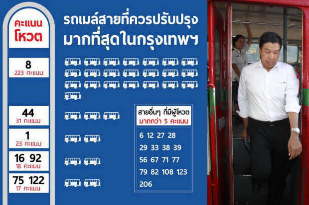 เมื่อวันที่ 14 ส.ค. ทีมงานเฟซบุ๊กของนายชัชชาติ สิทธิพันธุ์ รมว.คมนาคม ได้เผยแพร่ผลคะแนนโหวตสายรถเมล์ที่ควรปรับปรุงมากที่สุดและเรื่องร้องเรียน พบว่า สรุปคะแนนโหวตรถเมล์ที่ควรปรับปรุงมากที่สุด 5 ลำดับประกอบด้วย