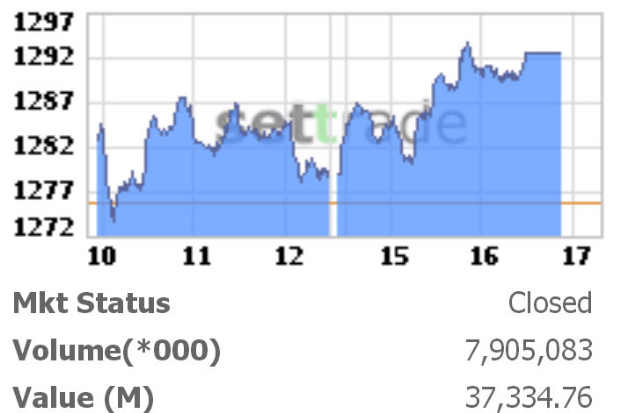 ตลาดหุ้นไทยวันที่ 29 ส.ค. ดัชนีหุ้นฟื้นตัวกลับมาบวก และเป็นไปในทิศทางเดียวกับตลาดหุ้นในภูมิภาค ส่งผลให้ท้ายตลาด ดัชนีหุ้นมาปิดที่ระดับ 1,292.53 จุด เพิ่มขึ้น 16.77 จุด หรือ 1.31% มูลค่าการซื้อขาย 37,334.76ล้านบาท
