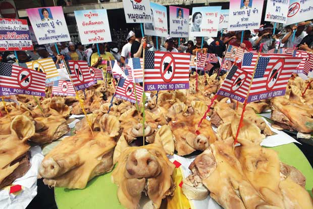 อนึ่ง เมื่อเดือน มิถุนายนที่ผ่านมา กลุ่มเกษตรกรผู้เลี้ยงสุกรทั่วประเทศ กว่า 5,000 ราย ได้รวมกันนำหัวหมูกว่า 100 หัว มาตั้งโต๊ะปักธูป ปิดถนนประท้วงบนถนนพิษณุโลก หน้าทำเนียบ เพื่อยื่นหนังสือถึงน.ส.ยิ่งลักษณ์ ชินวัตร นายกรัฐมนตรี คัดค้านการอนุมัติให้มีการนำเข้าเนื้อสุกรจากสหรัฐอย่างเด็ดขาดมาแล้วครั้งหนึ่ง .