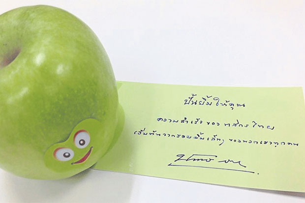 เท่านั้นยังไม่พอ คุณปั้นถึงกับลงทุนเซอร์ไพรส์พนักงานด้วยการสั่งแอปเปิลเขียว 2 หมื่นลูก พร้อมการ์ดที่เขียนด้วยลายมือตัวเองว่า “ปั้นยิ้มให้คุณ ความสำเร็จของกสิกรไทยเริ่มต้นจากรอยยิ้มของทุกคน” ส่งตรงถึงโต๊ะทำงานของพนักงานทุกคนตั้งแต่เช้าตรู่
