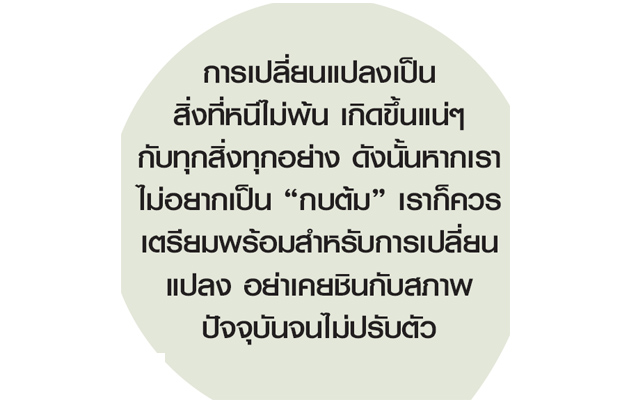 การเปลี่ยนแปลงเป็นสิ่งที่หนีไม่พ้น เกิดขึ้นแน่ๆ กับทุกสิ่งทุกอย่าง ดังนั้นหากเราไม่อยากเป็น “กบต้ม” เราก็ควรเตรียมพร้อมสำหรับการเปลี่ยนแปลง อย่าเคยชินกับสภาพปัจจุบันจนไม่ปรับตัว ต้องหมั่นสังเกตและกล้าที่จะเปลี่ยนแปลง สำคัญที่สุดคือเปลี่ยนแปลงตนเองครับ