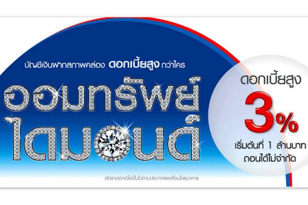 ล่าสุดธนาคารได้ออกเงินฝากออมทรัพย์แบบพิเศษเป็นเงินฝากออมทรัพย์ไดมอนด์ ที่ให้อัตราดอกเบี้ยสูงถึง 3% แต่จะต้องมีวงเงินฝากเริ่มต้น 1 ล้านบาท เพื่อตอบโจทย์การลงทุนที่มั่นคงกว่า และเป็นทางเลือกแก่ผู้ฝากเงินในยุคที่เศรษฐกิจยังคงผันผวนและอัตราดอกเบี้ยยังทรงตัวอยู่ในระดับต่ำ