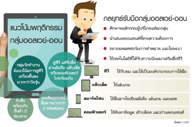 นอกจากนี้ ยังพบว่าดีไวซ์แต่ละชนิดยังมีการแบ่งประเภทการใช้งาน เช่น ทีวี มีไว้สำหรับรับชมรายการบันเทิงต่างๆ ขณะที่คอมพิวเตอร์จะเน้นการใช้งานด้านการค้นหาข้อมูล สร้างบล็อก และอ่านคอนเทนต์ต่างๆ ส่วนสมาร์ทโฟนจะเน้นการใช้งานด้านโซเชียลเน็ตเวิร์ก เล่นเกม และแชต ขณะที่แท็บเล็ตจะเน้นใช้เล่นเกมเป็นหลัก จากพฤติกรรมที่เปลี่ยนแปลงดังกล่าว ส่งผลให้นักการตลาดเรียกผู้บริโภคกลุ่มนี้ว่า “ออลเวย์-ออน” หรือกลุ่มอยู่หน้าจอตลอดเวลา
