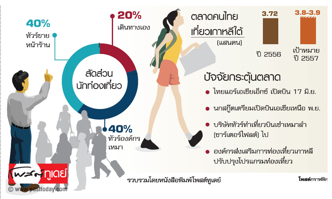พันธุ์เมธ ณ ระนอง ผู้จัดการการตลาด องค์กรส่งเสริมการท่องเที่ยวเกาหลี (เคทีโอ) ประจำประเทศไทย กล่าวว่า คนไทยที่ไปเกาหลีใต้เป็นกลุ่มเดินทางด้วยตัวเอง 20% ทัวร์หน้าร้าน 40% และกลุ่มท่องเที่ยวเป็นรางวัล (อินเซนทีฟ) ที่เหมาทัวร์ไป 40% กลุ่มเดินทางด้วยตัวเองมีแนวโน้มโต 10% ต่อปี สอดคล้องพฤติกรรมคนยุคนี้ที่ค้นหาข้อมูลเดินทางเอง เชี่ยวชาญจองตั๋วเครื่องบินราคาถูกทางออนไลน์ เมื่อมีไทยแอร์เอเชีย เอ็กซ์ รวมถึงสายการบินอื่นเปิดเส้นทางบินเกาหลีเพิ่ม จะเป็นผลดีต่อตลาดรวม ทำให้นักท่องเที่ยวกลุ่มเดินทางเองมีทางเลือกมากขึ้น ปีนี้เกาหลีใต้ตั้งเป้าหมายคนไทยไปเที่ยว 3.83.9 แสนคน เพิ่มเล็กน้อยจากปีก่อนที่มี 3.72 แสนคน