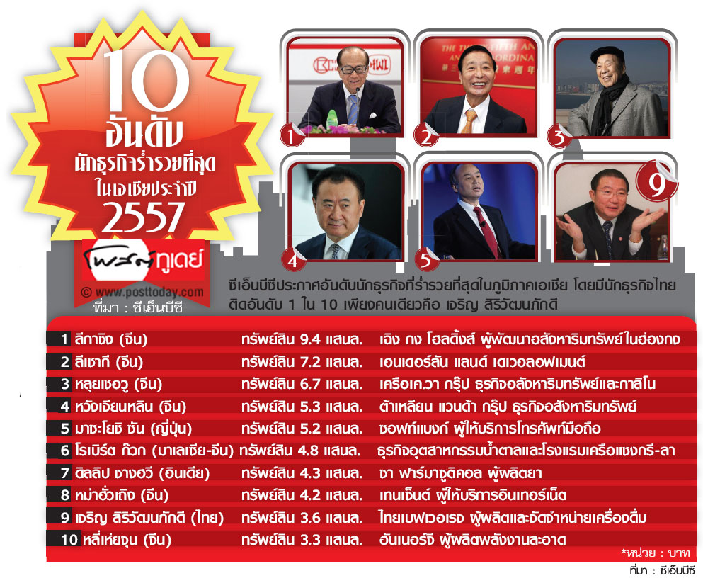 10 อันดับนักธุรกิจร่ำรวยที่สุดในเอเชียประจำปี 2557 ที่มา : ซีเอ็นบีซี
