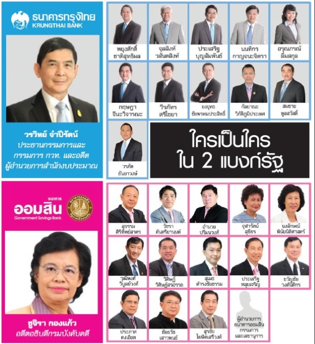 ธนาคารเฉพาะกิจของรัฐทุกแห่งมีคนจากฝ่ายการเมืองเข้าไปนั่งทั้งสิ้น แต่ที่ดูจะเยอะและ ให้ความสำคัญมากคือ “ธนาคารกรุงไทย” และ “ธนาคารออมสิน”
