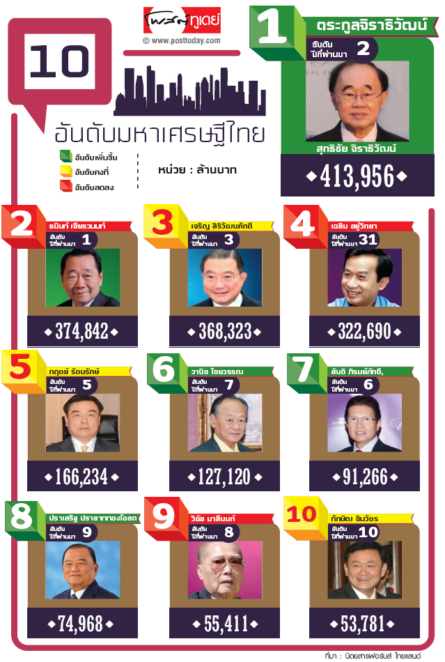 "เซ็นทรัล" เบียด"ซีพี" ขึ้นแชมป์ "ทักษิณ" ทรัพย์สินลด ชี้ 50 เศรษฐีไทยรวยขึ้น 15%