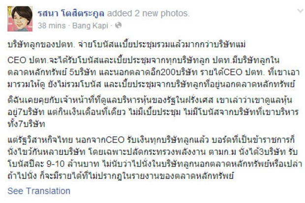 ทั้งนี้น.ส.รสนาได้โพสต์เอกสารเปรียบเทียบค่าตอบแทนกรรมการบริษัทระหว่าง บริษัท ปตท. (PTT) และ ปตท.สผ. (PTTEP) ปี 2556 พบว่า บริษัท ปตท.สผ. จ่ายค่าตอบแทนกรรมการบริษัท 68.6 ล้านบาท ขณะที่ ปตท.จ่ายค่าตอบแทน 61.4 ล้านบาท