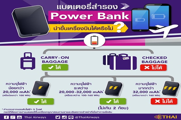 เพจเฟซบุ๊กการบินไทย โพสต์อินโฟกราฟิกเพื่อไขข้อข้องใจเกี่ยวกับการพกพกแบตเตอรี่สำรอง หรือ Power Bank ขึ้นไปบนเครื่องบินโดยมีรายละเอียดดังนี้