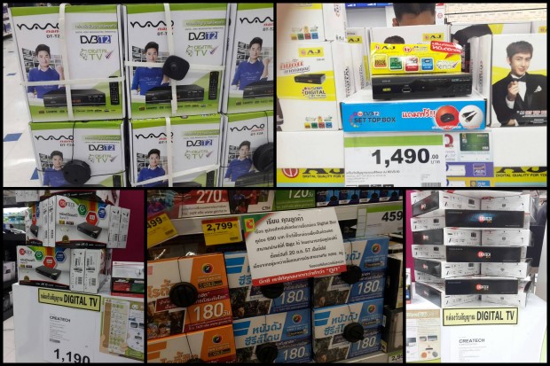จากการสำรวจการจำหน่ายกล่องรับสัญญาณทีวีดิจิทัล หรือเซตท็อปบ็อกซ์ ถึงกิจกรรมส่งเสริมการขายที่จัดผ่านร้านค้าปลีกต่างๆ ช่วงสุดสัปดาห์ที่ผ่านมา ในส่วนของห้างเทสโก้ โลตัส จากการสอบถามพนักงานขายกล่องเซตท็อปบ็อกซ์ ได้รับข้อมูลว่า กล่องเซตท็อปบ็อกซ์ แต่ละแบรนด์ตอนนี้ยังไม่มีการทำโปรโมชั่น มีเพียงการทยอยปรับราคาลดลงเพื่อให้ลูกค้าซื้อได้ง่ายขึ้น เช่น กล่องทีวีดิจิทัลยี่ห้อสามารถปรับราคาขายลงจากกล่องละ 1,490 บาท เหลือ 1,390 บาท