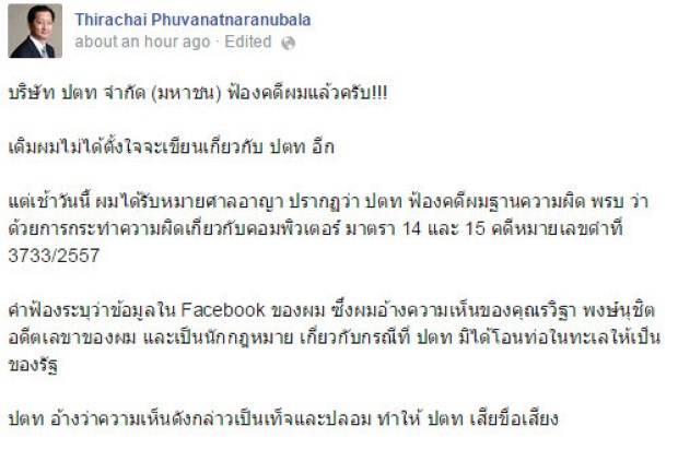 เมื่อวันที่ 2 พ.ย. นายธีระชัย ภูวนาถนรานุบาล อดีตรมว.คลัง โพสต์ข้อความผ่านเฟซบุ๊กส่วนตัว Thirachai Phuvanatnaranubala ระบุว่า ได้ถูก บริษัท ปตท. ฟ้องร้องในความผิดตามพรบ.ว่าด้วยการกระทำความผิดเกี่ยวกับคอมพิวเตอร์ กรณี โพสต์ข้อความประเด็น กรณีที่ ปตท. มิได้โอนท่อในทะเลให้เป็นของรัฐ โโยข้อความของ นายธีรชัยระบุว่า