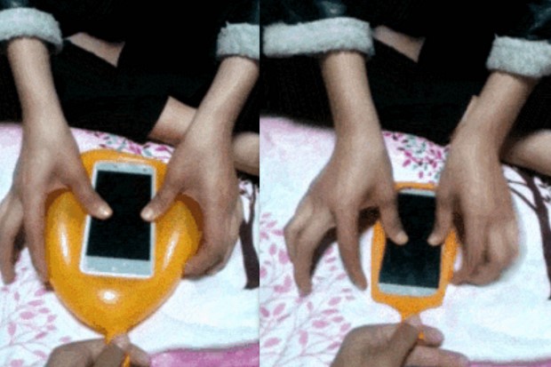 วิธีง่ายๆ เพียงแค่เป่าลูกโป่งให้ใหญ่กว่าตัวเครื่องสมาร์ทโฟน แล้วนำสมาร์ทโฟนวางไว้ตรงกลางลูกโป่ง ก่อนค่อยๆ กดมือถือลงพร้อมปล่อยลมลูกโป่งออก จนะได้เป็นเคสมือถือตามภาพ