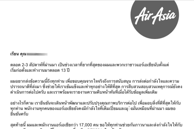 บอสใหญ่แอร์เอเชียร่อนสารขอบคุณกำลังใจลูกค้าสายการบิน