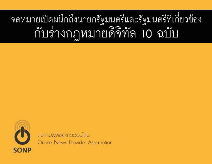 สมาคมผู้สื่อข่าวออนไลน์ (SONP) ยื่นจดหมายเปิดผนึกถึงนายกรัฐมนตรี เพื่อเรียกร้องให้ชะลอการพิจารณาร่างกฎหมายดิจิทัล พร้อมเปิดการรับฟังความคิดเห็นจากประชาชนและภาคส่วนที่เกี่ยวก่อนเข้าสู่วาระการพิจารณา โดยมีเนื้อหาดังต่อไปนี้