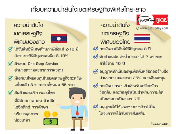 ทั้งนี้ พื้นที่ดังกล่าวจะได้รับสิทธิพิเศษด้านภาษีตั้งแต่ 2-10 ปี แล้วแต่ขนาดธุรกิจ โดยอัตราภาษีจะเฉลี่ยที่ 8-10% ซึ่งเป็นอัตราเดียวกับธุรกิจท้องถิ่นของลาว นอกจากนี้ รัฐบาลได้จัดระบบบริการเบ็ดเสร็จ ณ จุดเดียว (One Stop Service) เพื่ออำนวยความสะดวกแก่นักลงทุน