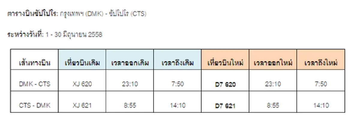 วันที่ 15 พ.ค. สายการบินไทย แอร์เอเชีย เอ็กซ์ ยืนยันให้บริการบินตรงจากกรุงเทพฯ สู่เมืองซัปโปโร ประเทศญี่ปุ่น ระหว่างวันที่ 1 - 30 มิ.ย. 2558 ได้ตามปกติ โดยได้รับอนุญาตจากจากกรมการบินพลเรือนของไทย และกรมการบินพลเรือนของประเทศญี่ปุ่น (Japan Civil Aviation Bureau หรือ JCAB) ให้สามารถทำการบินได้ในเส้นทางบินไป-กลับ กรุงเทพฯ (DMK) - ซัปโปโร (CTS) ผ่านความร่วมมือของสายการบินแอร์เอเชีย เอ็กซ์ (มาเลเซีย) ด้วยเครื่องบินแอร์บัส เอ330-300 ขนาด 377 ที่นั่ง โดยเปลี่ยนแปลงหมายเลขเที่ยวบินระหว่างวันที่ 1-30 มิถุนายน 2558 จาก Code XJ มาเป็น D7 ดังรายละเอียดด้านล่าง ทั้งนี้ ผู้โดยสารเส้นทางบินไป-กลับ กรุงเทพฯ (DMK) - ซัปโปโร (CTS) ในช่วงระยะเวลาดังกล่าว สามารถเดินทางมาขึ้นเครื่องที่ท่าอากาศยานดอนเมืองตามกำหนดเวลาเดิม และรับบริการต่างๆ ของทางสายการบินได้ตามปกติ