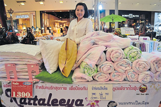 ผลิตภัณฑ์ที่จำหน่าย มีผ้าปูที่นอน ชุดเครื่องนอนคอตตอน หมอนขนเป็ดเทียม (ไมโครเจล) เป็นแบบเดียวกับหมอนขนห่านเทียม วัตถุดิบไมโครเจลนำเข้ามาจากเกาหลี กำลังการผลิตเดือนละ 300 ใบ ราคาใบละ 1,390 บาท ผ้าปูที่นอนขนาด 6 ฟุต ราคา 1,900 บาท/ชุด และผ้าห่มขนเป็ดเทียม ราคา 990 บาท ปลอกผ้านวมนำผ้าสีต่างกันมาเย็บต่อกันอย่างกลมกลืน ราคา 1,390 บาท