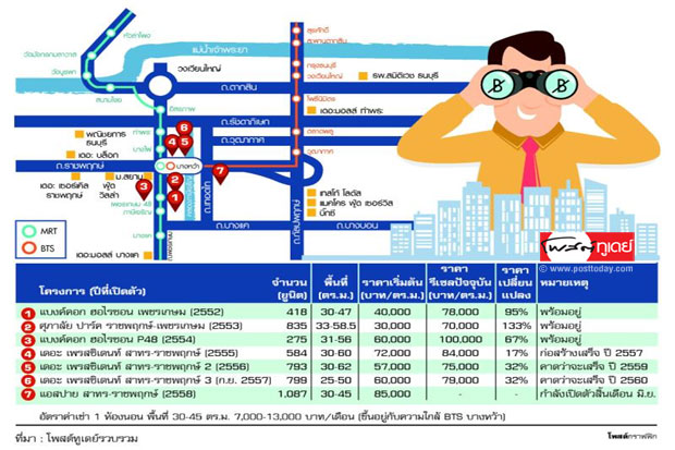 วิทการ จันทวิมล รองกรรมการผู้อำนวยการ สายงานกลยุทธ์การตลาด บริษัท เอพี (ไทยแลนด์) กล่าวว่า คอนโดเกาะแนวสถานีกรุงธนบุรี-สถานีบางหว้าในรัศมีประมาณ 500 เมตร ที่เปิดขายตั้งแต่ปี 2552 ถึงเดือน ก.พ. 2557 มีประมาณ 31 โครงการ รวมประมาณ 1.49 หมื่นหน่วย แบ่งเป็นโครงการที่สร้างเสร็จแล้ว 14 โครงการ รวมประมาณ 5,300 หน่วย อยู่ระหว่างการก่อสร้าง 11 โครงการ ประมาณ 6,500 หน่วย และยังไม่ก่อสร้างอีก 6 โครงการ ประมาณ 3,100 หน่วย คาดว่าจะก่อสร้างแล้วเสร็จทุกโครงการภายในปี 2561
