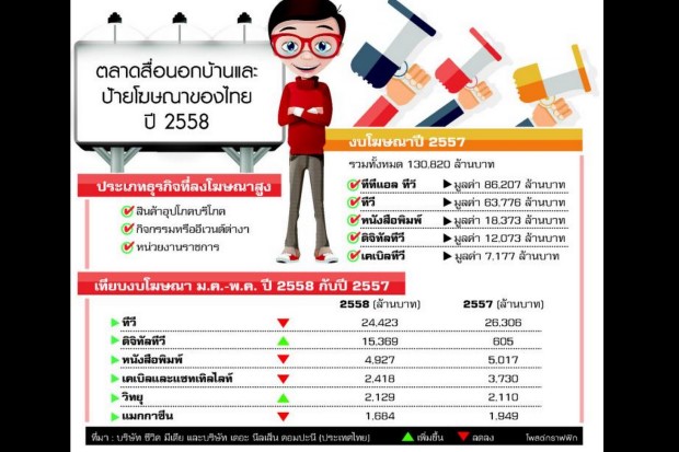 สำหรับช่วงปลายปี 2557 จนถึงปัจจุบัน ช่วง 5 เดือนแรก มีการเติบโตประมาณ 26% ส่วนการโฆษณาบนดิจิทัลทีวีช่วงปี 2557 ที่ผ่านมา ยังไม่มีใครกล้าลงโฆษณาเลย จนเริ่มมีความชัดเจนขึ้นเมื่อช่อง 3 เริ่มผลักดันให้สินค้าต่างๆ เข้ามาลงโฆษณาได้ทั้งช่องทางดิจิทัลทีวีและทีวีอะนาล็อกพร้อมกัน ทำให้มีสัดส่วนการเติบโตเพิ่มขึ้นเรื่อยๆ แต่ก็ไม่ถือว่าเป็นการเติบโตแบบกะทันหัน ในขณะที่เคเบิลทีวีกับแซทเทิลไลท์ทีวีมีแนวโน้มลดลง ส่วนวิทยุก็ไม่ค่อยมีการเติบโต ในขณะที่สื่อสิ่งพิมพ์เริ่มมีการโฆษณาลดลง ส่วนป้ายบิลบอร์ดโตเพิ่มเฉลี่ยประมาณ 5%