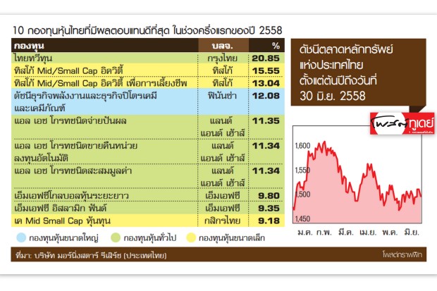 ข้อมูลผลดำเนินงานครึ่งแรกของปี 2558 ของกองทุนหุ้นไทย โดยบริษัท มอร์นิ่งสตาร์รีเสิร์ซ (ประเทศไทย) พบว่ามีกองทุนหุ้นไทยมากถึง 155 กองทุน หรือ 2 ใน 3 จากกองทุนไทยทั้งหมด 225 กองทุน ที่มีผลตอบแทนต่ำกว่าดัชนีตลาดหลักทรัพย์แห่งประเทศไทยรวมเงินปันผล (SET TR) ที่ให้ผลตอบแทน 2.34%