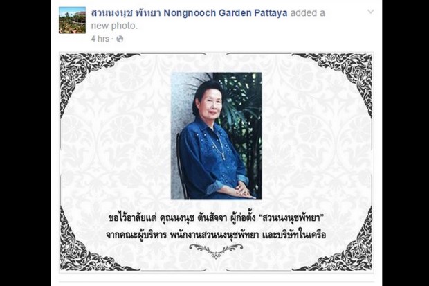 "นงนุช ตันสัจจา" ผู้ก่อตั้งสวนนงนุช พัทยา เสียชีวิตแล้ว ครอบครัวตั้งสวดอภิธรรมที่วัดธาตุทอง 5-10 ส.ค.
