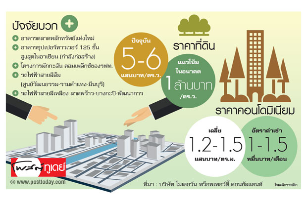 หากอาคารสำนักงานใหญ่ของตลาดหลักทรัพย์ฯ เปิดใช้ในเดือน พ.ย.-ธ.ค. จะกลายเป็นแม่เหล็กสำคัญในด้านการลงทุน ยังไม่รวมอาคารสำนักงานของกลุ่มจีแลนด์ ที่ส่งผลให้ย่านนี้เป็นแหล่งงานขนาดใหญ่ที่มีความต้องการที่อยู่อาศัยจำนวนมาก แต่ราคาที่ดินถือว่ายังไม่สูงมากอยู่ที่ประมาณ 5-6 แสนบาท/ตารางวา (ตร.ว.) เมื่อเทียบกับเขตธุรกิจชั้นในที่ปัจจุบันขยับขึ้นไปแตะ 1.5-1.9 ล้านบาท/ตร.ว.แล้ว จึงมีแนวโน้มว่าราคาที่ดินย่านนี้จะขยับขึ้นไปแตะ ตร.ว.ละ 1 ล้านบาทได้ไม่ยาก