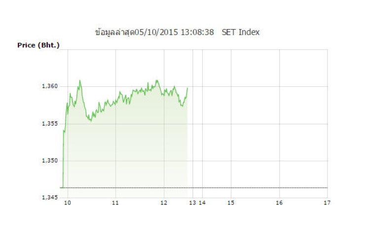 หุ้นไทย 5 ต.ค. ปิดภาคเช้าที่ 1,359.86 จุด เพิ่มขึ้น 13.51 จุด มูลค่าการซื้อขาย 16,526.33 ล้านบาท