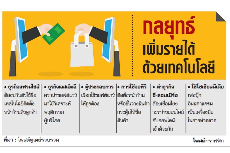 แนวโน้มคนไทยที่หันมาทำธุรกิจของตัวเองมากขึ้น และเริ่มมีอายุน้อยลง 20-25 ปี ขณะที่ทิศทางการแข่งขัน นับวันสินค้าจะใช้สงครามราคากระตุ้นยอดขาย ผู้ประกอบการต้องปรับตัวให้ทัน เร่งสร้างความแตกต่าง เทคโนโลยีถือว่าเป็นหัวใจสำคัญ ช่วยสร้างรายได้และทำให้ธุรกิจก้าวไกลทันกับโลกยุคดิจิทัล