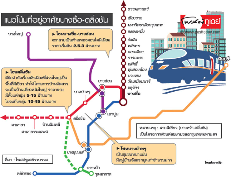 สำหรับตลาดที่อยู่อาศัยค่อนข้างมีความแตกต่างกันตามระยะทางที่ห่างไกลจากถานีบางซื่อออกไป คือช่วงที่ไม่ไกลจากสถานีบางซื่อมากนักจะมีโครงการคอนโด แต่ในช่วงที่ไกลออกไปจนถึงรอบๆ สถานีตลิ่งชันกลับเป็นพื้นที่ที่มีโครงการบ้านจัดสรรเปิดขายหลายโครงการ แต่ไม่มีโครงการคอนโดเลย